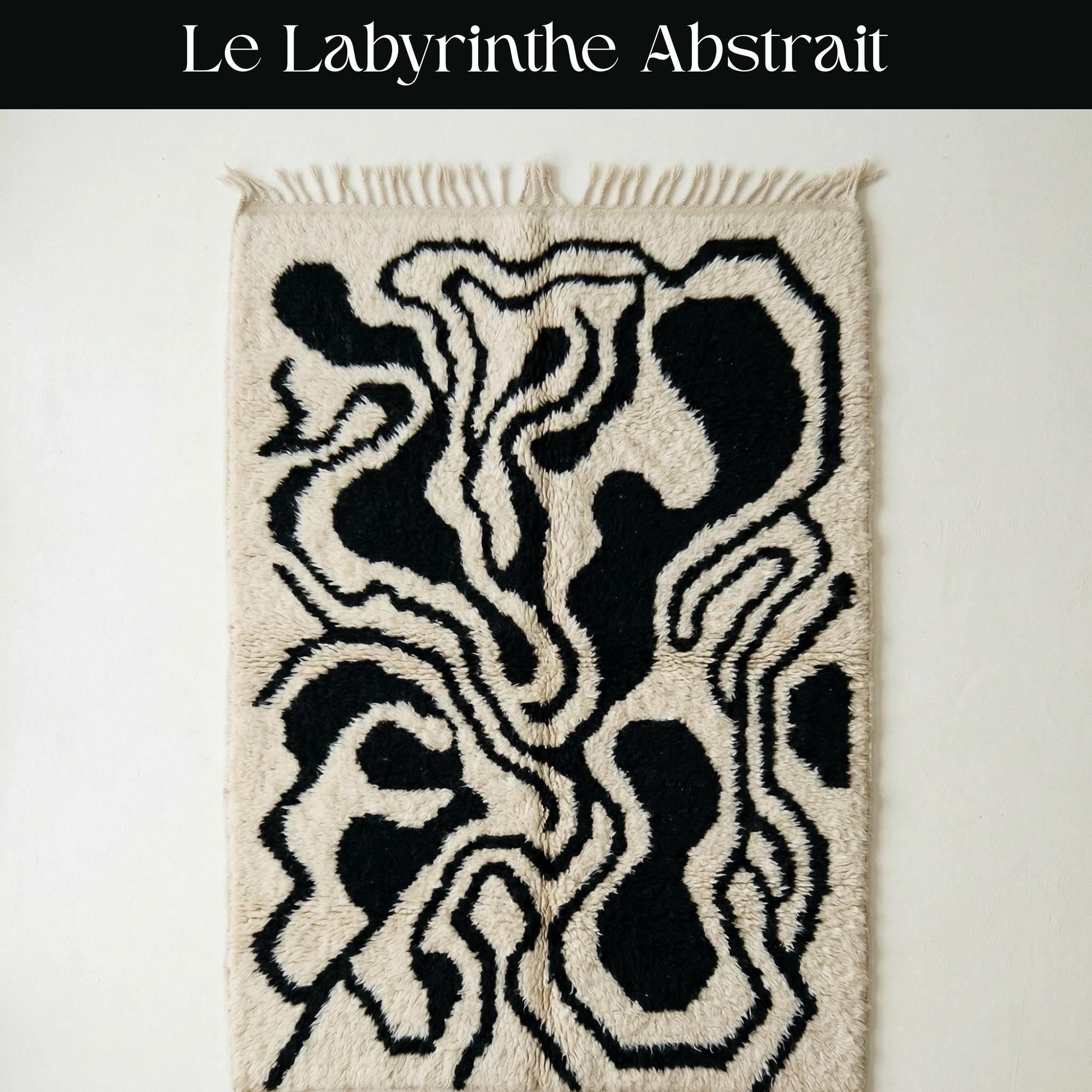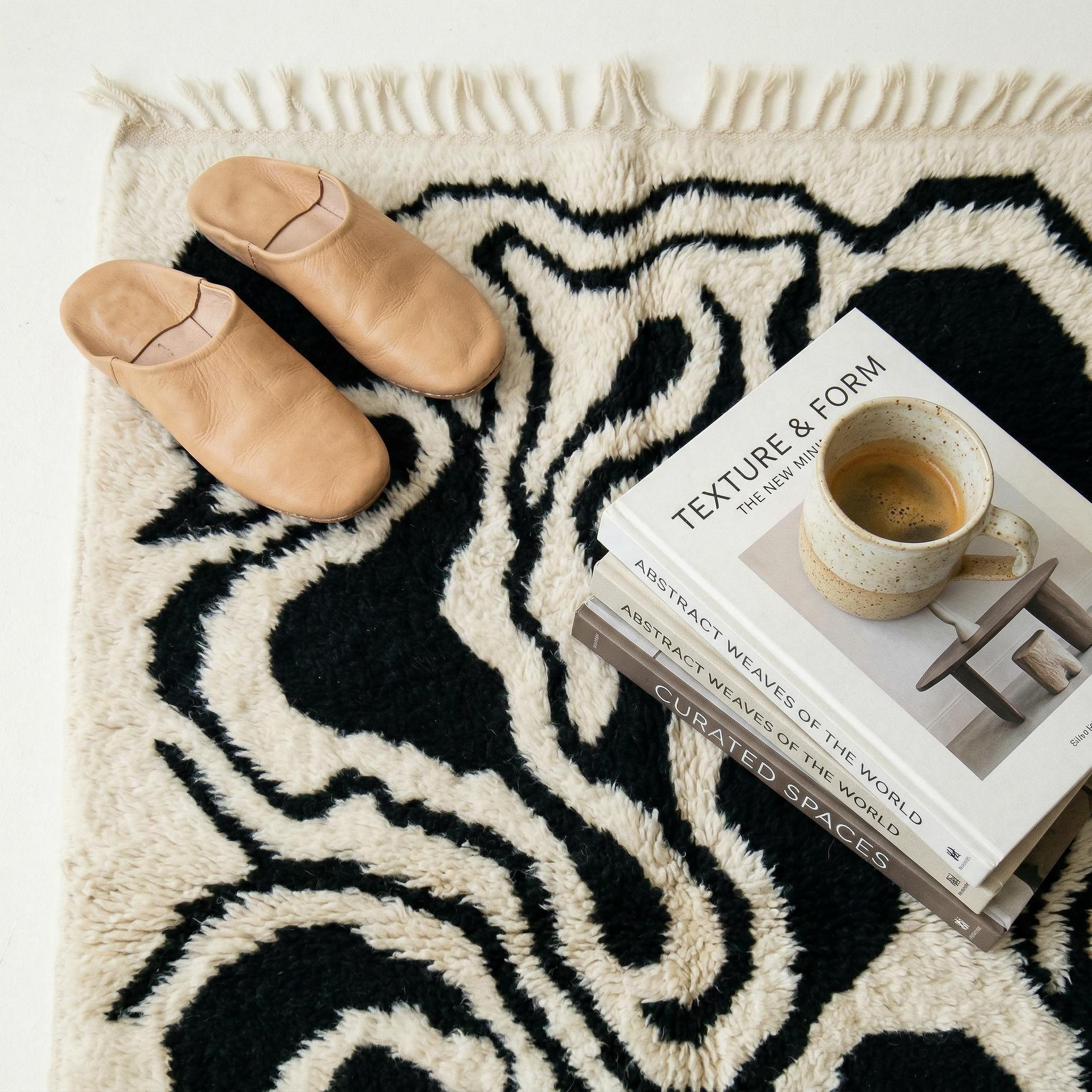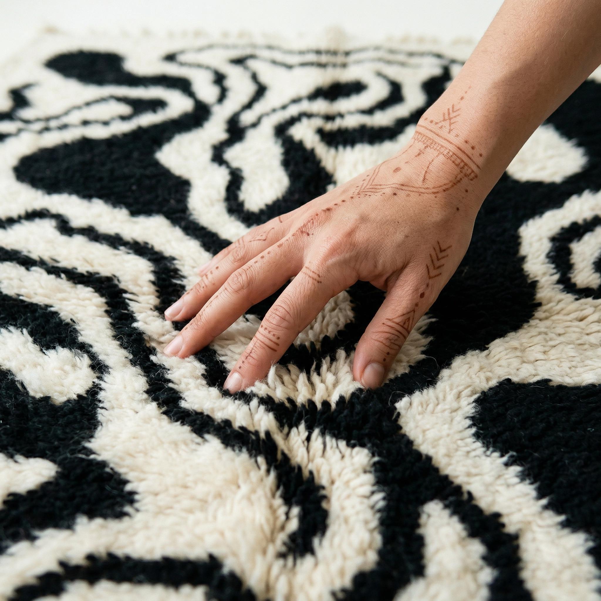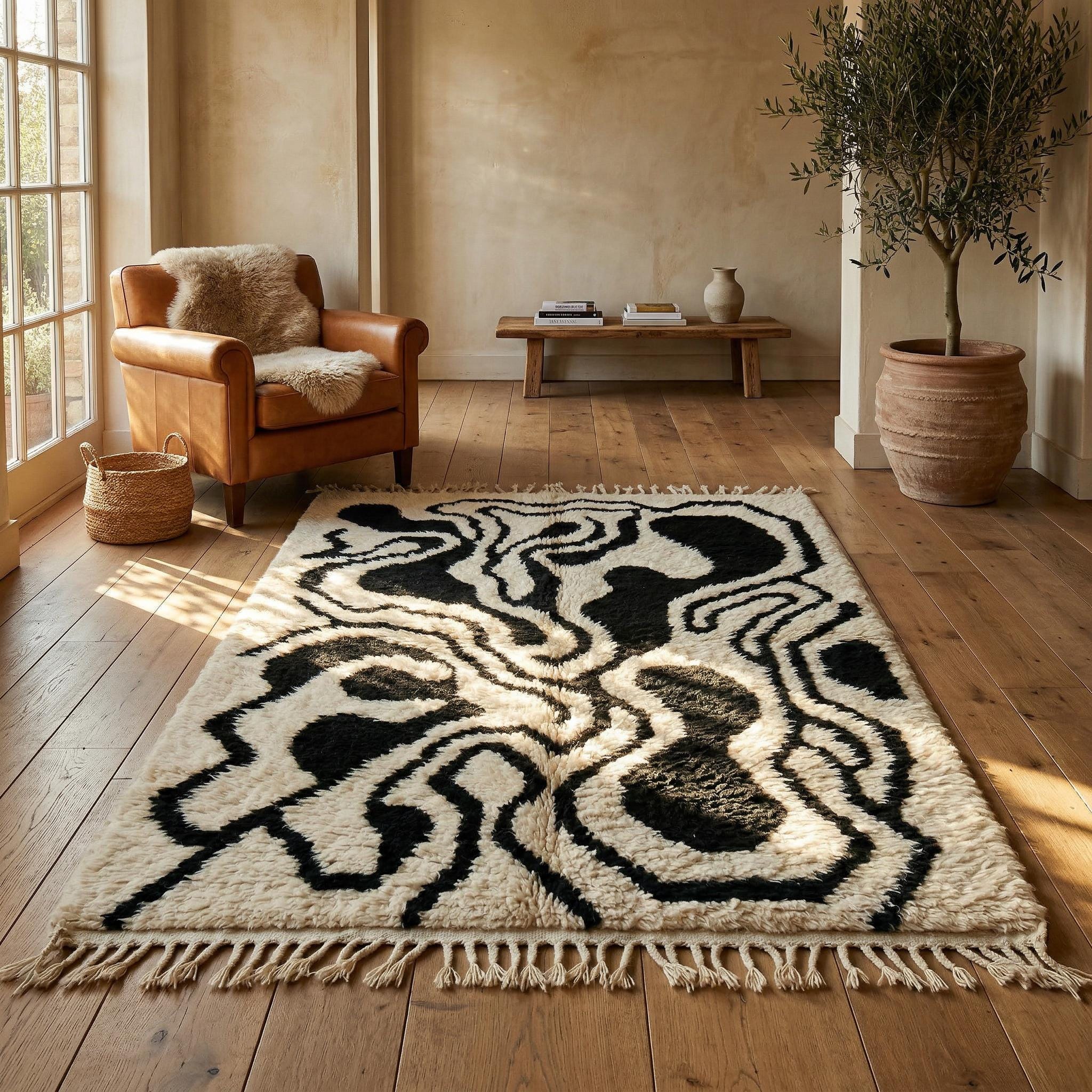 Abstract Wavy Beni Ourain Rug | Modern Black and White Moroccan Wool Shag | Contemporary Organic Line Carpet | Custom Handmade Area Rug