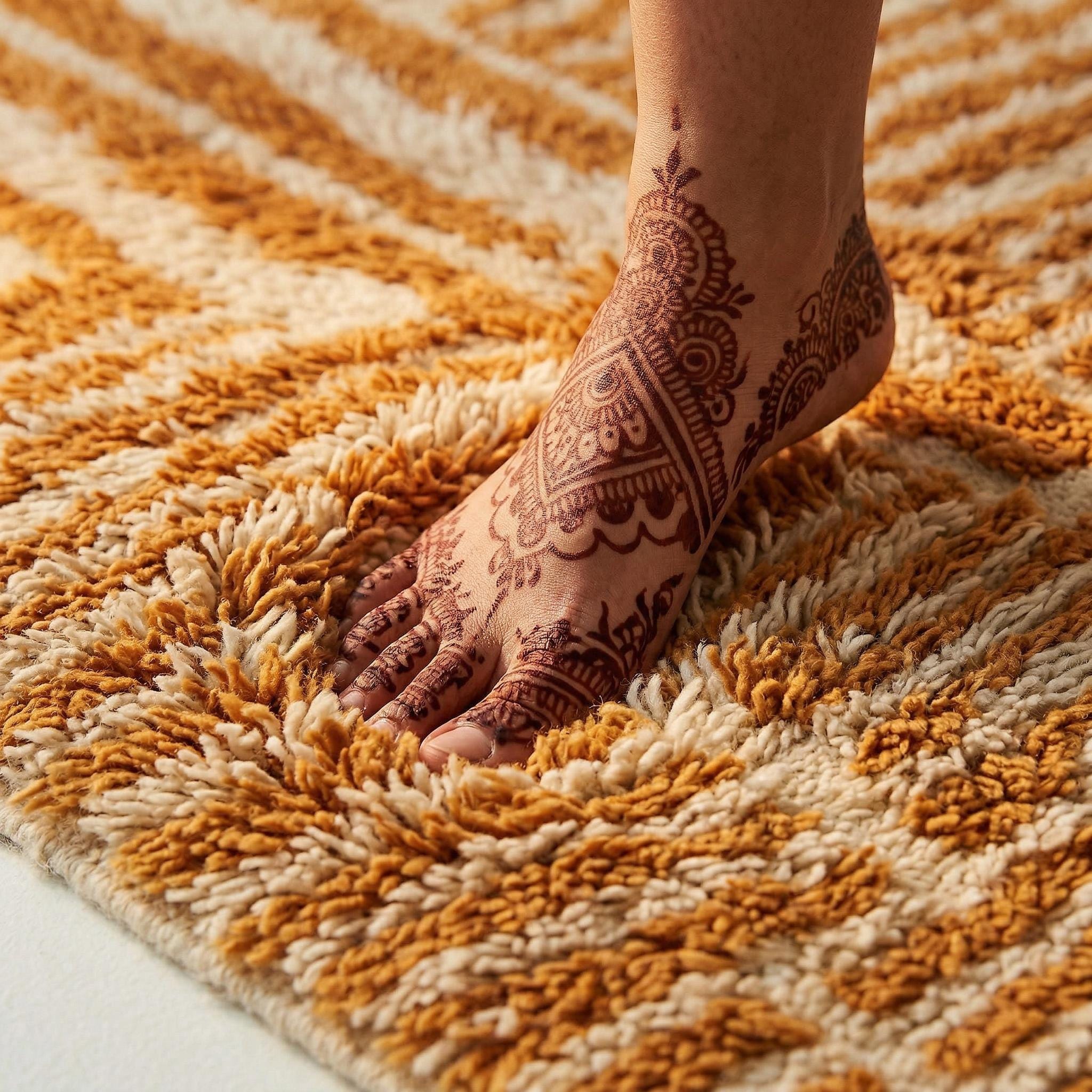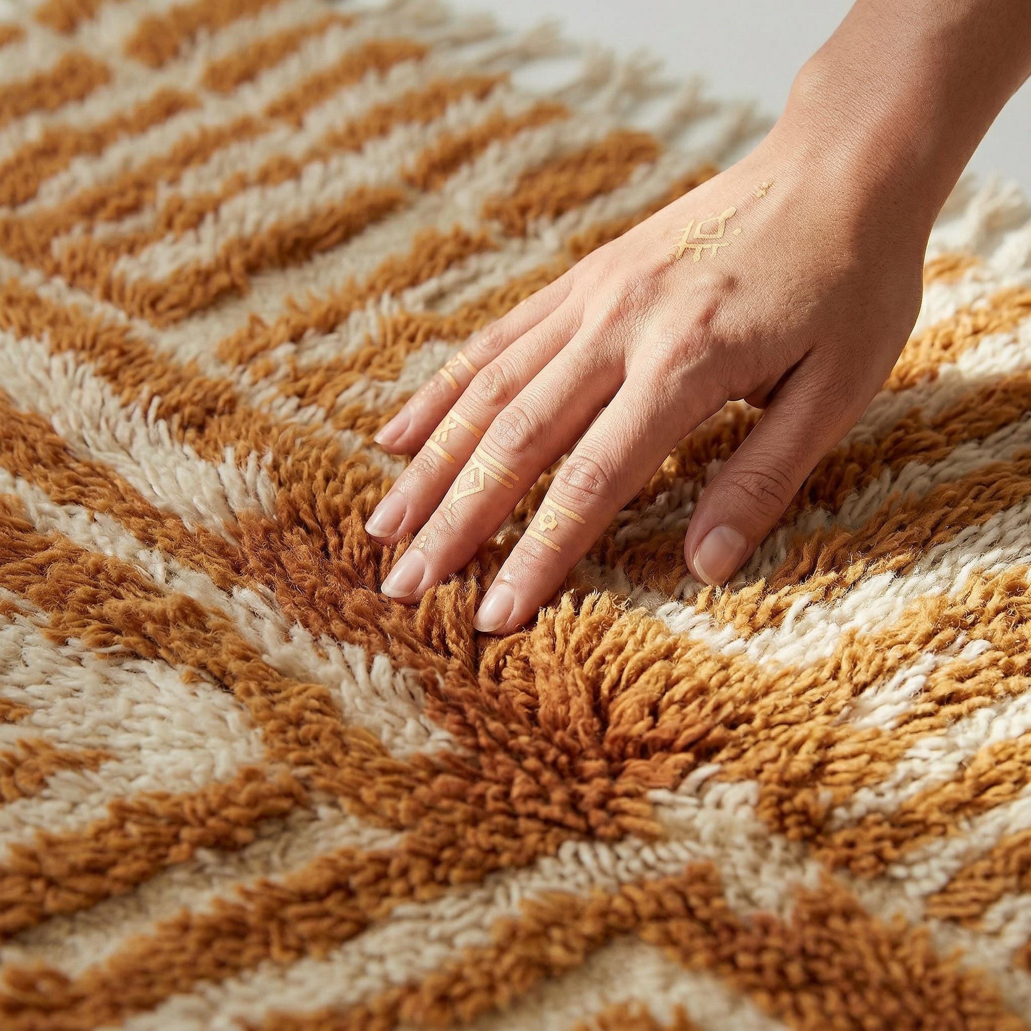 The images shown are high-fidelity design visualizations created to showcase the artistic concept. As each rug is custom-made to order, the final physical product will feature unique handmade characteristics. While the overall design and plush thickness will meet our high standards, minor details—such as the exact thickness of the rust lines or the pile height—may differ slightly from the digital concept, ensuring your rug is a truly one-of-a-kind work of art.