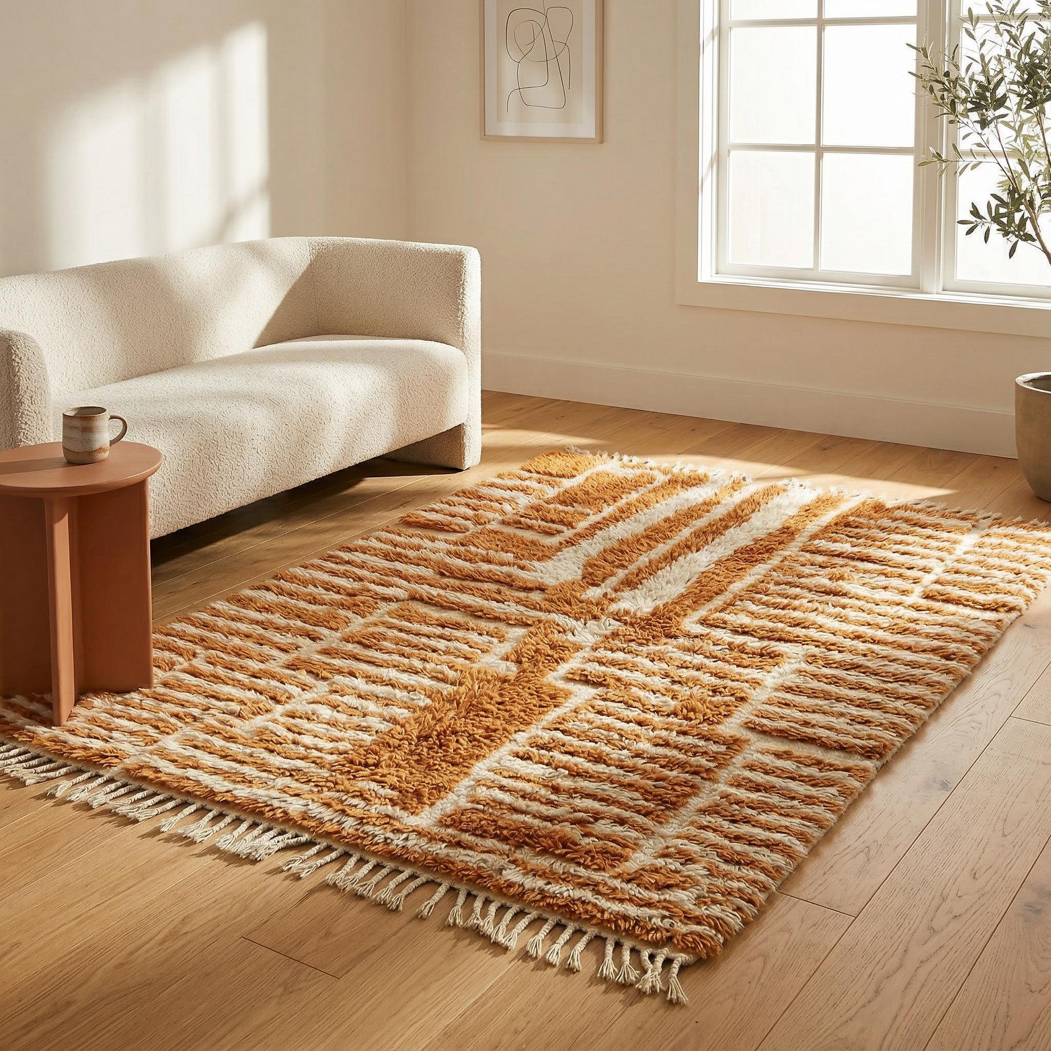 Terracotta Geometric Moroccan Rug | Rust and Cream Wool Shag | Boho Maze Beni Ourain Carpet | Custom Handmade Mid Century Area Rug