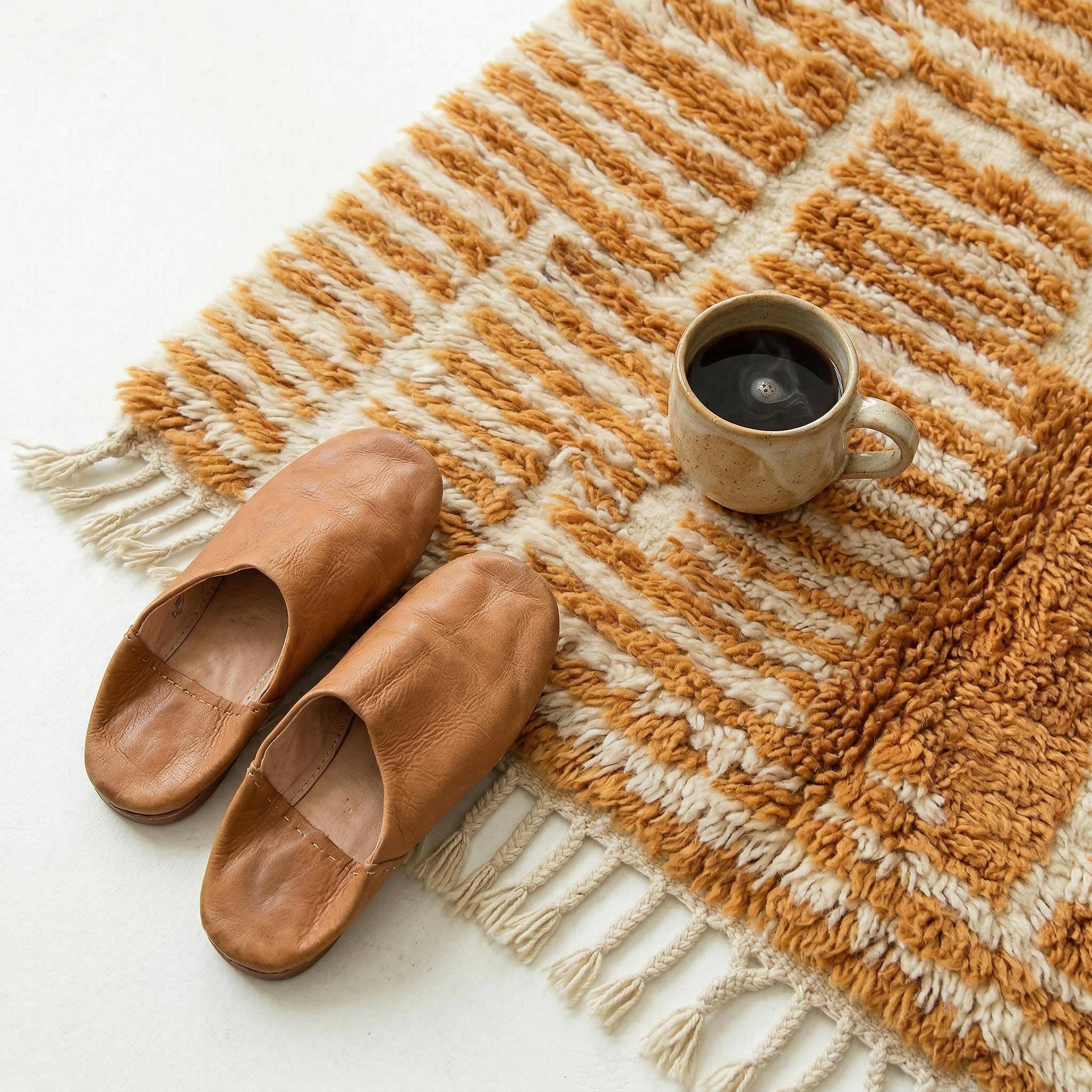 A Moroccan style known for its soft wool pile and simple graphic designs—originally made by the Beni Ourain tribes.
