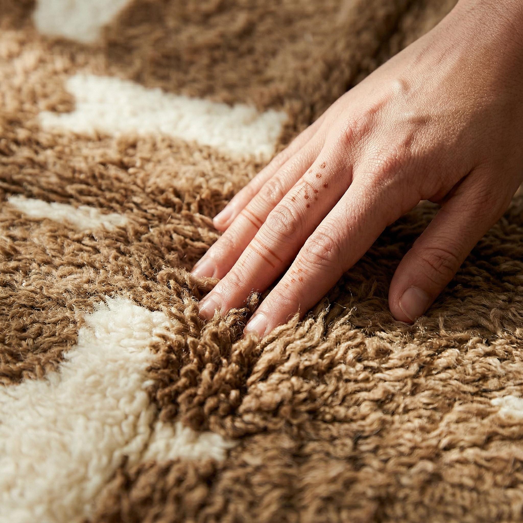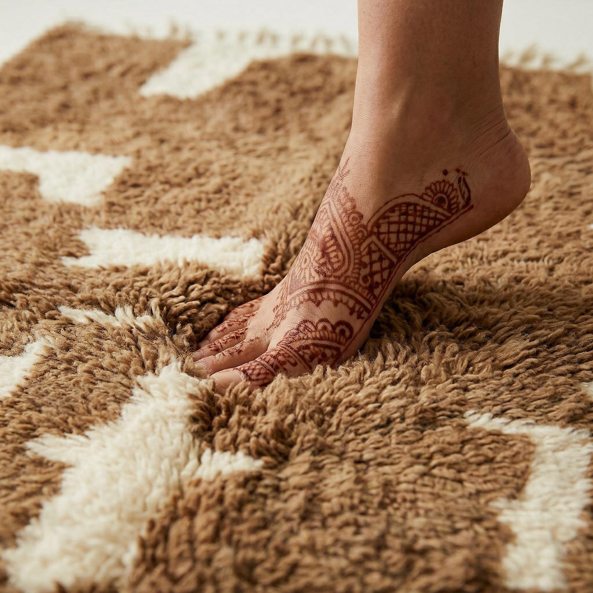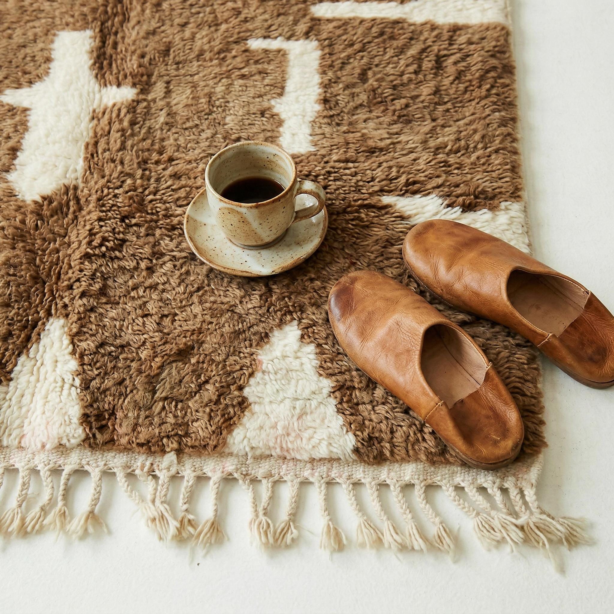 If you want to bring warm, architectural elegance into your home, this modern brown color-block Moroccan rug is the answer. It functions as a dynamic, eye-catching anchor for a sleek living room or a sophisticated bedroom, proving that Moroccan weaving can beautifully adapt to modern interior design trends. Whether in a chic city loft or a cozy mid-century home, this plush rug offers unmatched comfort and style.